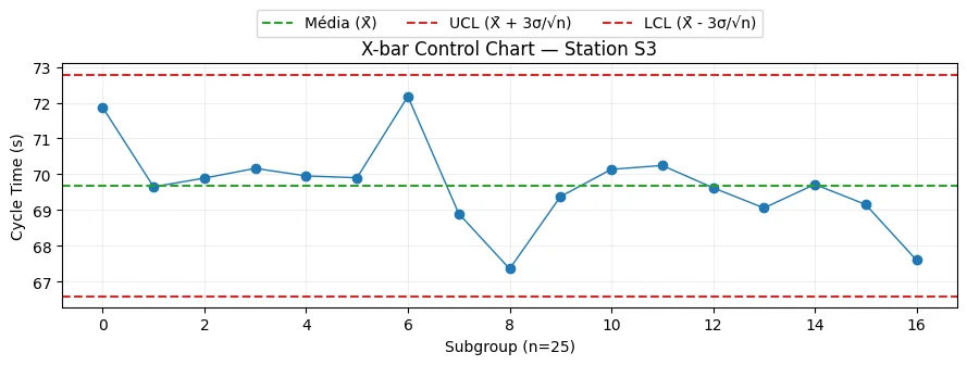 In the automotive industry, for example, maintaining process stability on assembly lines is critical to ensuring quality and reducing costs. An X-bar control chart, built with the Matplotlib library, is a classic tool for monitoring average cycle times across production batches: