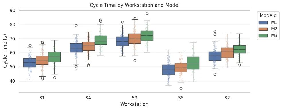 With the Seaborn library, it’s possible to understand the variation in cycle times between different stations and models, identify bottlenecks, and optimize processes. This type of visualization can display statistics that reveal hidden patterns within the data: